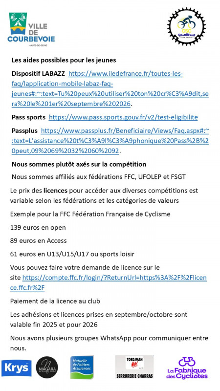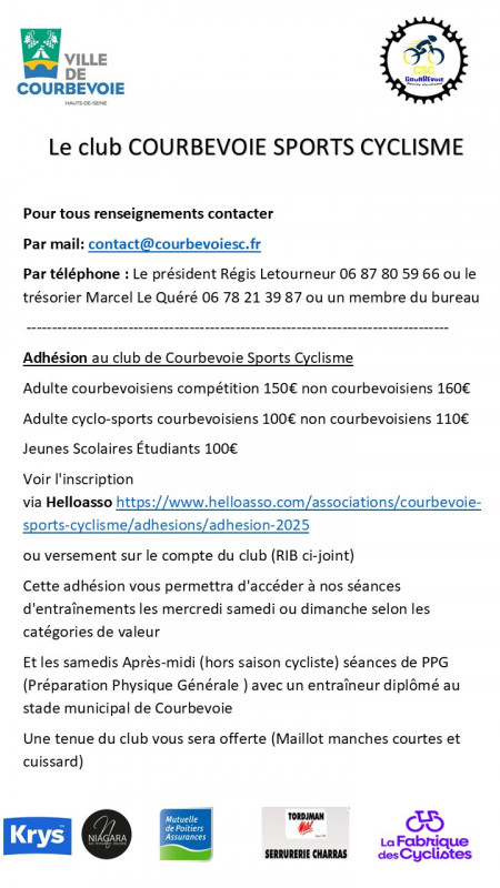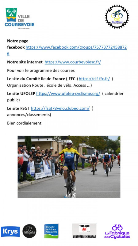 Le Club Cycliste de Courbevoie est un club orienté exclusivement vers la pratique du vélo de route et non du VTT.
